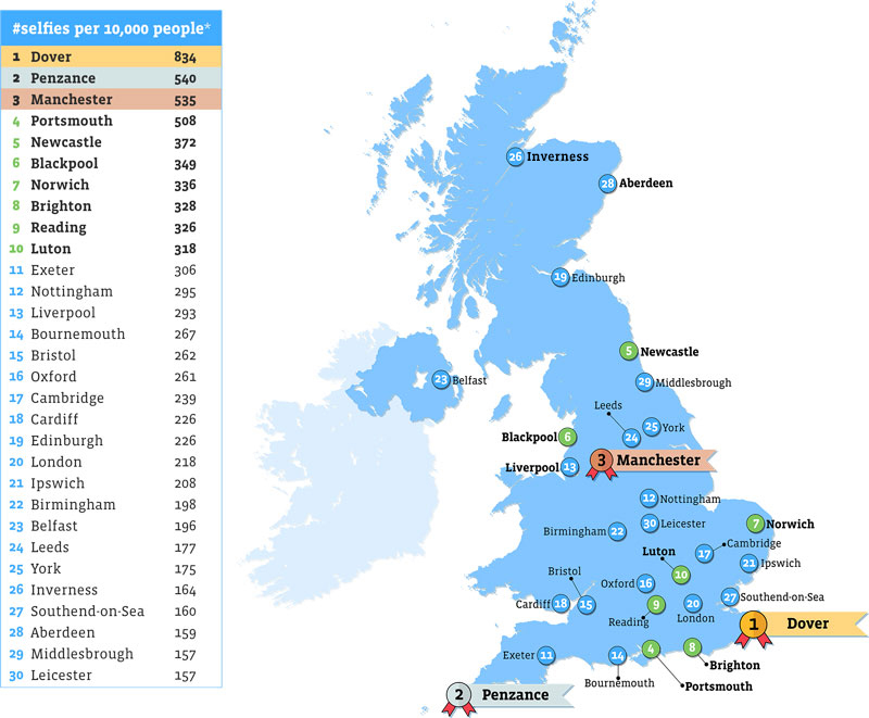 It does seem there’s some connection between living by the coast and selfie-taking, too. Of the top 30 most #selfie-loving towns and cities, half of them were on the coast or very close to it; with Dover, Penzance, Portsmouth, Blackpool and Brighton all making the top 10.